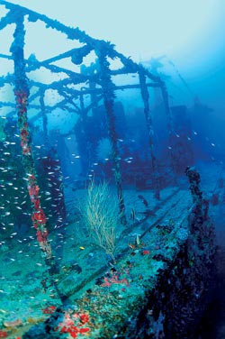 El pecio British Loyalty, hundido en 1946, yace de lado a 33 m de profundidad en Addu Atoll. La visibilidad no suele ser perfecta pero la vida abunda. Se explora desde el puente hasta la hélice. Hay corales negros, pequeños peces y, a veces, una gran barracuda en la penumbra. Ideal para amantes del buceo en historia.